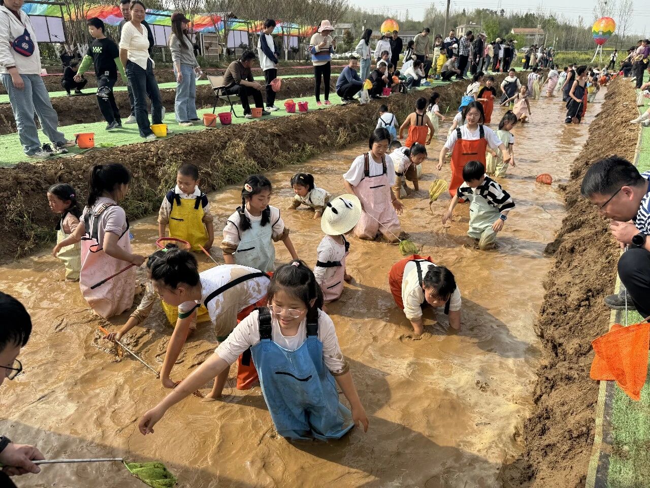 亲子互动更是本次活动的重头戏,N多趣味项目让大小朋友玩到不想走。趣味闯关环节中,蒙眼抓鸭、迷宫捡鸡蛋、草坪抓猪比赛轮番上演,抓到、捡到的“战利品”可直接带回家,成就感拉满;清水摸鱼全天不定时投放鱼苗,小朋友挽起裤脚、拿起抄网,在水中追逐嬉戏,家长也能趁机找回童年乐趣;还有超萌小猪跳水、枕头大战等项目,全程欢声笑语不断。
