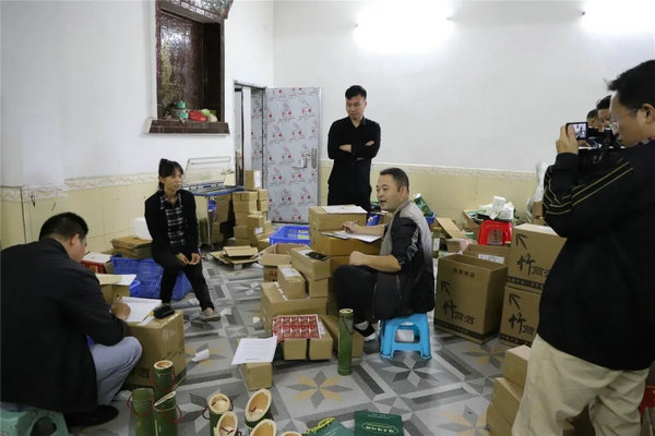 经过清点,执法人员依法查扣灌酒器等制酒设备2套,电脑主机3台,包装竹筒酒38箱以及大量零散竹筒酒,各类外包装盒包装袋1万余个,大量标签纸,原料竹酒25升装339桶、48升装24桶,以及案值1万余元初包装腊肉。涉案物品装满3大卡车,当天参与行动的娄底市和双峰县市场监管和公安执法人员忙碌到深夜才将查扣的涉案物资入库。