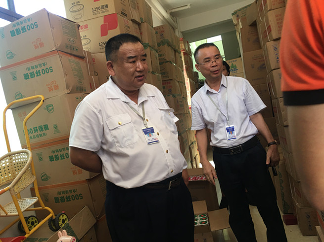 海口市市场监管局郑廷安副局长(左一)和和琼山分局文局长(右一)查看一次性不可降解塑料制品