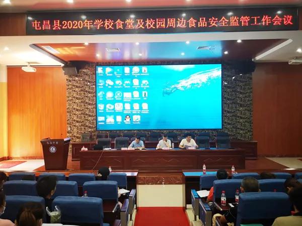 此次会议观看了食品安全宣传视频;屯昌县市场监管局餐饮监管室主任陈健通报了2020年春季学校食堂及校园周边食品经营单位食品安全专项检查工作情况,认真分析了当前学校食堂食品安全形势,从管理制度、人员管理、设施设备管理、食品原料管理、过程控制、留样管理、餐饮具清洗消毒和保洁等方面进行讲解;屯昌县教育局副局长朱汉华通报了屯昌县创建省级食品安全示范学校食堂情况,勉励各学校继续开展好创建工作。