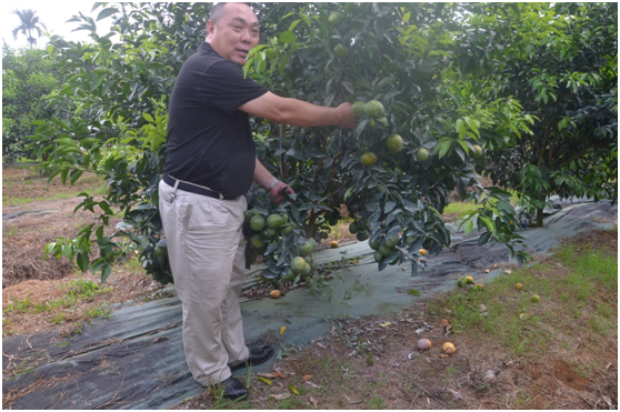 海南农垦南金农场有限公司副总经理张维亮查看沃柑果树