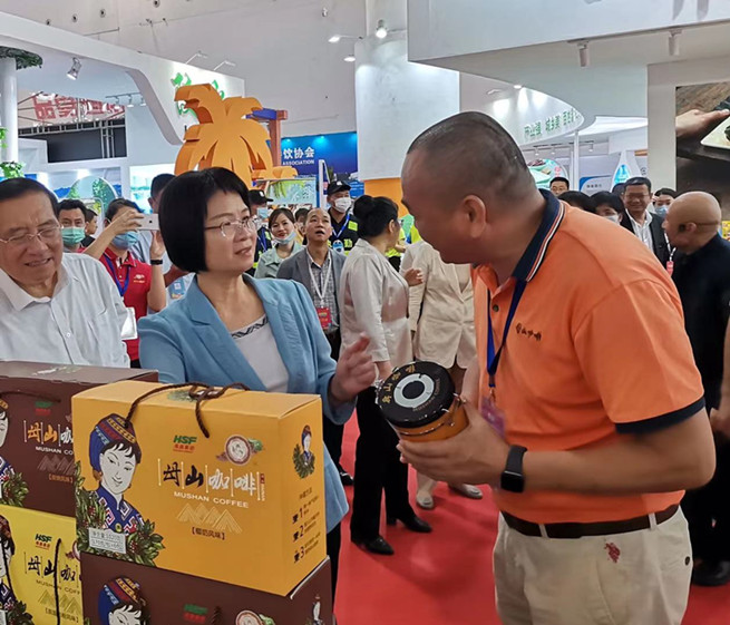 开幕式仪式结束后,海南省苻彩香副省长在省旅文厅厅长孙颖等领导的陪同下,来到位于B馆的母山咖啡展台,询问了解母山咖啡的产品及市场情况,苻彩香副省长还特别关心了母山咖啡在产业发展过程中的扶贫帮扶工作,肯定了母山咖啡勇于承担社会责任的做法,希望母山咖啡在海南农垦的改革与发展中有所作为。