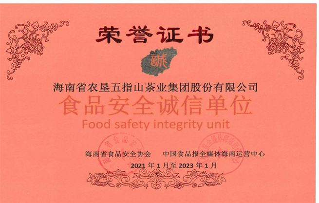 中国食品安全网讯(陆和 刘苗 关照羊)近日,海南海垦茶业集团收到海南省食品安全协会和中国食品报全媒体海南运营中心联合颁发的荣誉证书,被授予食品安全诚信单位(2021年1月至2023年1月)。