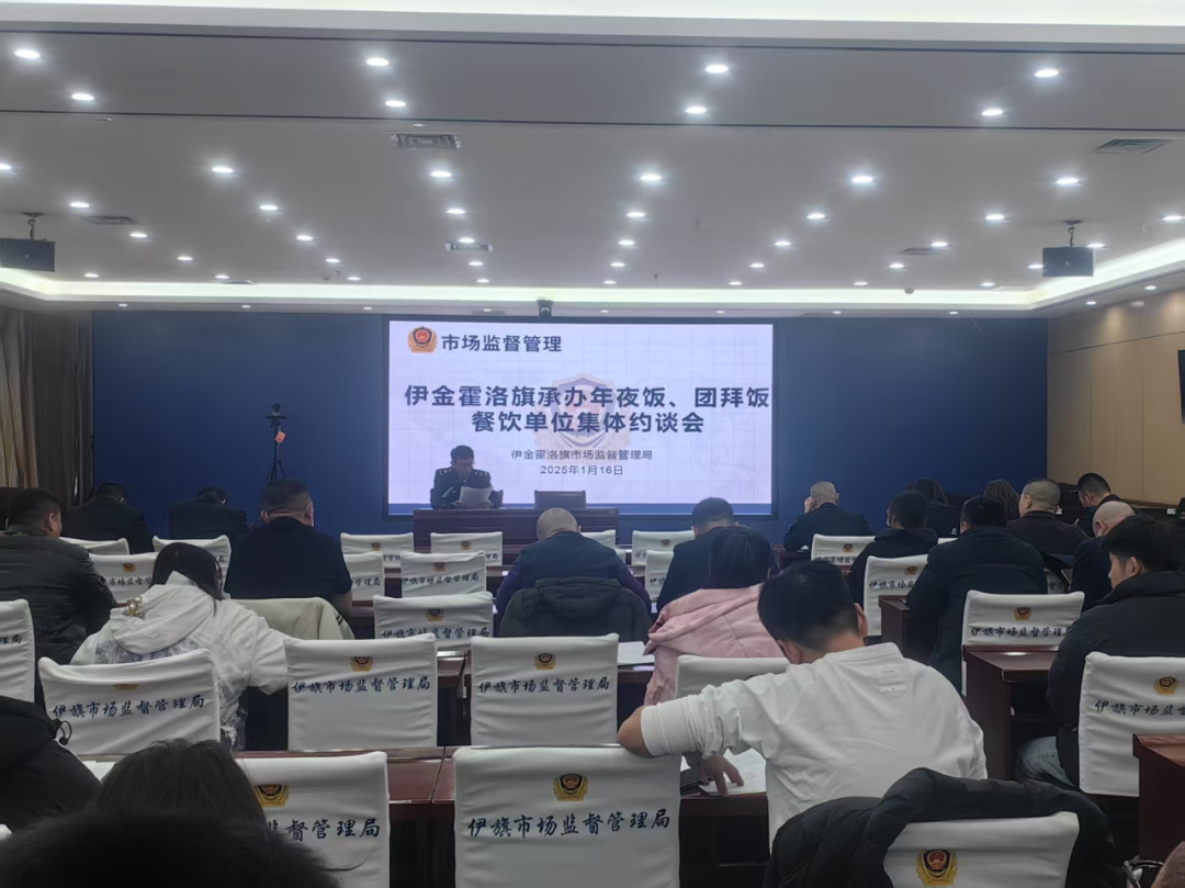 1月16日,伊金霍洛旗市场监督管理局组织承办年夜饭和集体聚餐的28家餐饮单位负责人和食品安全员,通过培训约谈的形式保障春节期间群众“舌尖上的安全”。