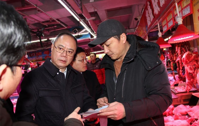 中国食品安全网讯(刘承鑫)近日,青岛市市场监管局张杰局长来到位于四川路31号青岛市南区鑫大众团岛农贸市场进行调研,听取市场负责人对市场的经营秩序和经营状况的介绍,与市场经营业户进行交流,详细了解他们的困难和需求,特别是在售生肉的检验检疫证明以及目前猪肉的价格和供应等。从农贸市场调研结束后,张杰局长、高健区长等又来到八大峡市场监管所,视察了所容所貌,了解基层所工作人员和日常监管情况,并为在一线工作的同志带去元旦春节的亲切问候。