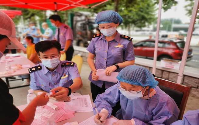 在时间紧、任务重的情况下,8月8日、9日组织机关全体干部职工义务奉献,每天上午7时开始会同8个街道市场监管所开展冷链食品从业人员核酸检测工作,顶烈日、斗酷暑、战高温,全体干部职工不惧高温、不惧辛劳、加班加点、齐心协力,经过两天紧张艰苦的努力,实现核酸采样检测信息登记、采样、录入和实时通讯同步推进、同步完成。