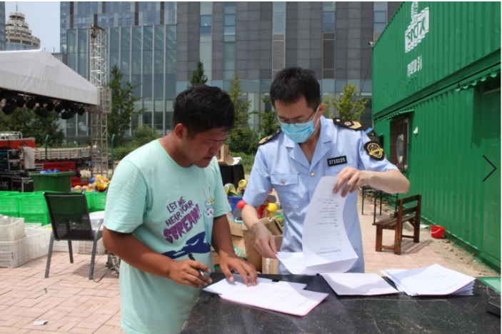 执法人员对啤酒节主会场餐饮单位经营者进行检查