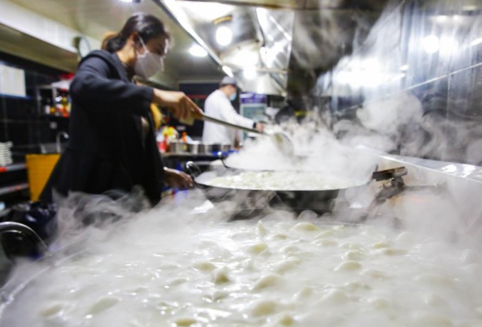 早上9点半,在鸿涛苑私房菜的厨房里看到了厨师们辛勤忙碌的身影。虽然是简单的水饺,在制作流程和品质把控上绝不马虎。李沧餐饮行业商会秘书长高刚告诉我们:“我们今天为各社区监测点准备了一千多份水饺。”
