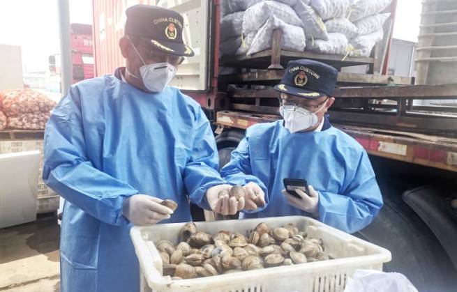关员现场监管查检出口活帘蛤 陈军摄