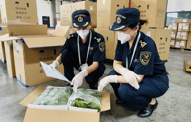 海关关员快速验放出口保鲜紫苏叶 刁伟摄