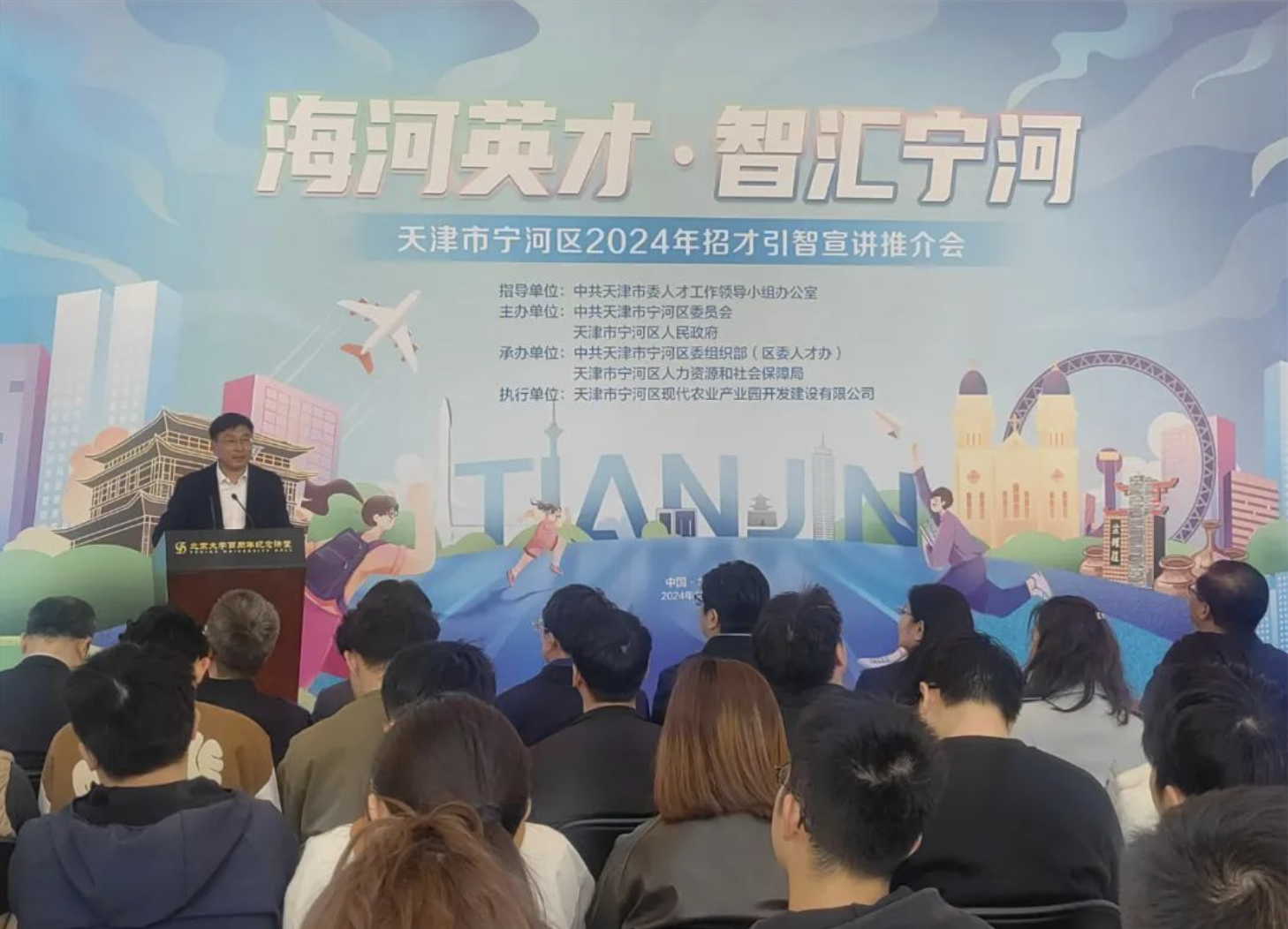 采访大学生宁河推介,引才北大在“海河英才·智汇宁河”推介会上,宁河城市推介、圆桌对话、重点企业与学生交流等环节拉近了宁河与北大学子的距离。同时,宁河积极与名校“结姻缘”,签订了人才合作框架协议,共同搭建起校企互相融合、共享发展的桥梁。天津市宁河区委书记白凤祥在致辞中说道:“年初,习近平总书记视察天津时,提出了‘四个善作善成’的重要要求。我们对标看齐、紧跟紧随,在发展新质生产力上作出了一系列探索,布局打造了新能源、新材料、新部件、新食品、新经济‘五新’产业集群,这里面有很多领域,对于宁河、对于天津来说,都是新兴领域,我们比任何时候都更加渴望青年人才,也更能成就青年人才。”“百周年纪念讲堂”广场上,宁河区结合区内重点企事业单位岗位需求与院校专业特色,围绕事业单位、国有企业、高新技术企业3大板块,精挑细选了23家优质单位“组团”上阵,携“政策礼包”和48个优质岗位,向北大学子发出诚挚邀约,推进优质岗位与优秀人才双向奔赴。