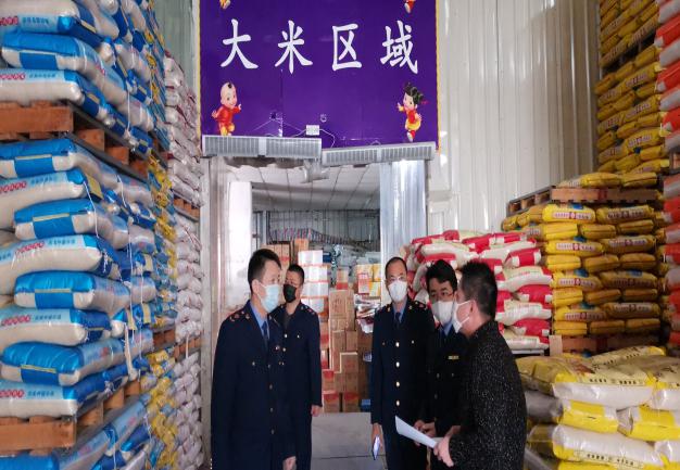 图为执法人员检查粮油批发店