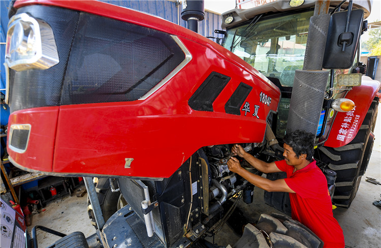 9月2日,河北省武强县金田农机专业合作社的技术人员在检修拖拉机。
