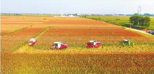 近日,阜城县10万余亩红高粱喜获丰收。图为红高粱收割现场。焦磊 苗凤强 摄