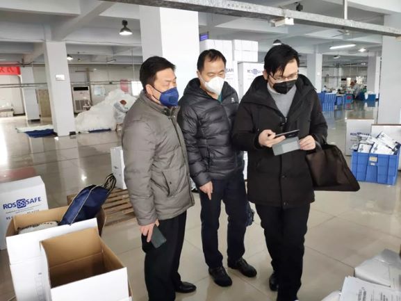 邯郸市市场监管局的同志在防护用品生产企业点对点帮扶(左一为杨良才同志)