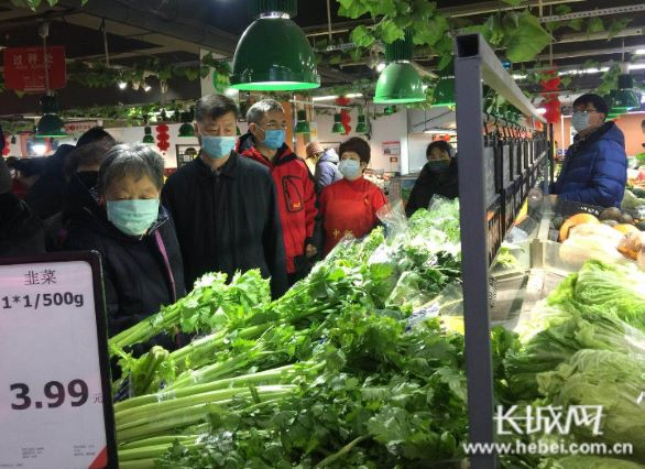 顶花带刺的黄瓜、嫩绿的生菜、新鲜的鲈鱼……3月3日上午,在河北省秦皇岛市海港区广缘超市内,各类生活必需品琳琅满目,货物充足,人们在井然有序地选购。