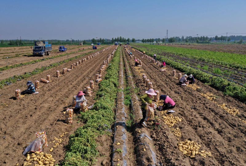 7月4日,河北省滦州市小马庄镇的农民在收获马铃薯。