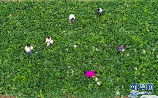 7月7日,在河北省故城县建国镇姜圈村蔬菜基地,种植户在采摘冬瓜(无人机拍摄)。