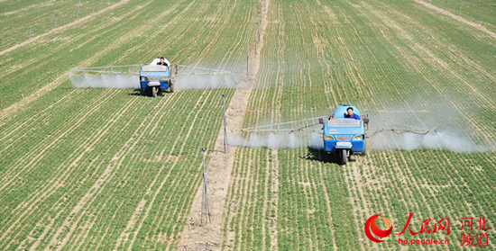 定州市东留春乡北邵村村民正在对1200余亩黑小麦喷洒离子钙肥料。 白永民摄