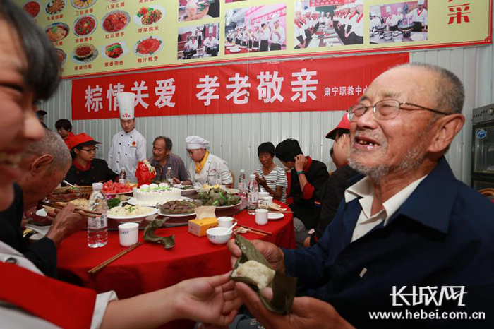 日前,肃宁县职教中心烹饪专业的师生们迎来一批特殊客人,由肃宁县援老志愿者协会的志愿者把该县偏远乡村的孤寡老人接到学校参观校区建设,老人们在餐厅品尝学生们包的粽子和精心烹制的美味佳肴,浓浓的亲情,满满的关爱,让孤寡老人们感受到社会大家庭的温暖,也让学生们深受教育。(杨进涛 蒋爱丹)