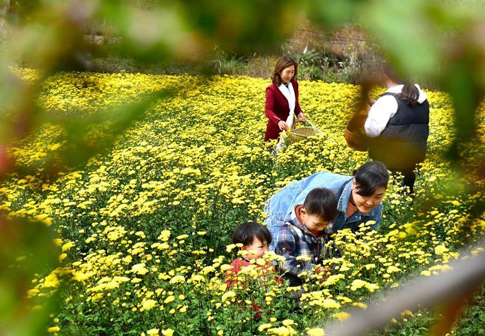 村民们在采摘菊花