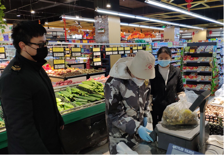 为确保配送过程安全有序,太平溪市场监管所联合综合执法局太平溪分局全天驻守万富超市,检查采购员、志愿者、超市员工的防护措施、身体状况,维护采购秩序,对自行购物群众,进一步宣传线上订购线下配送方式,减少辖区外出人员,提高群众防护意识。