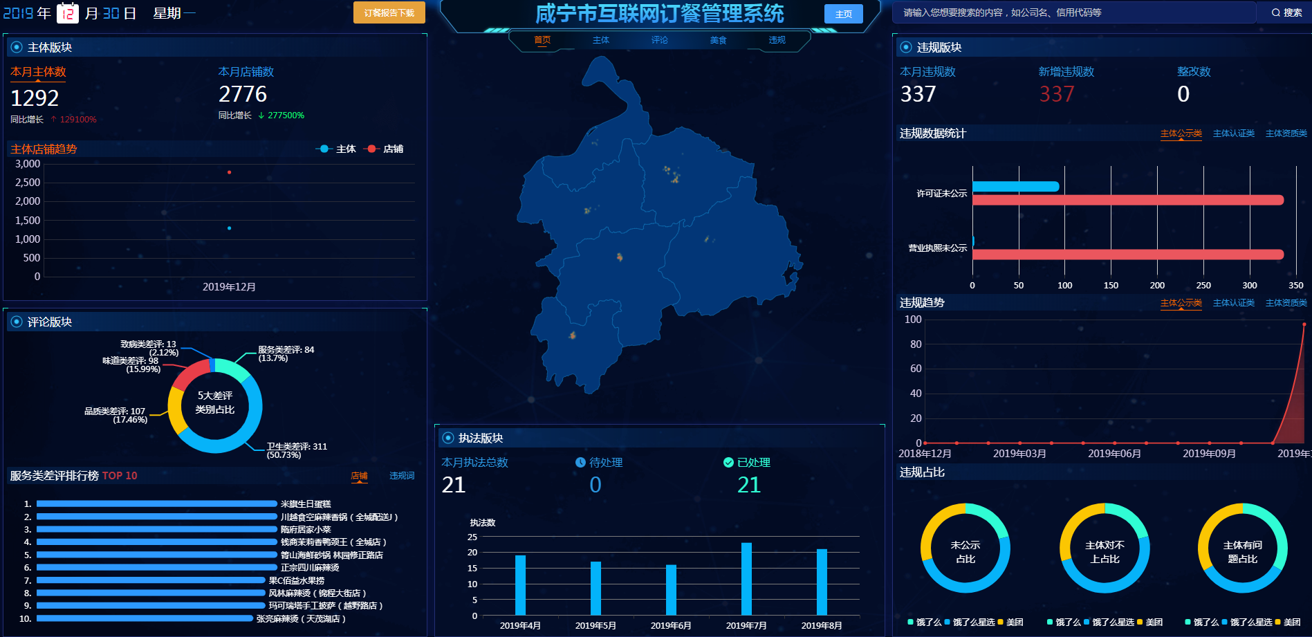 中国食品安全网讯(熊源 记者胡毅)2019年12月31日,记者从咸宁市市场监督管理局了解到,在“互联网+”时代,网络订餐和网上食品交易成为百姓消费的主要渠道,针对部分黑作坊持假证上线、消费者投诉增加,以及传统监管手段已经遇到瓶颈等问题,咸宁市市场监督管理局用一年的时间,在湖北省率先研发出两套“以网管网”的智慧监管利器——“咸宁市互联网订餐监管理系统”“咸宁市电商食品流通监管系统”,系统利用最新的大数据监测技术对主流电商平台、本地自建平台、网络订餐平台进行全面监测,破解传统人工监管的瓶颈。