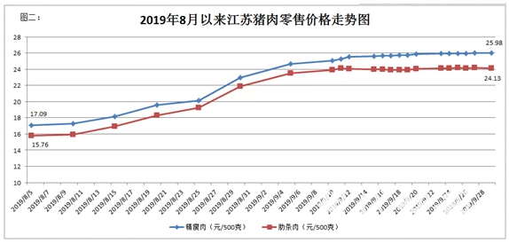9月下旬以来,江苏猪肉零售价格有涨有落,小幅波动,高位企稳。9月23日,全省精瘦猪肉平均零售价格为每500克25.94元,之后连续两天小幅回落,27日回升至25.98元,29日价格与27日持平。9月29日,全省精瘦猪肉平均零售价格为每500克25.98元,比9月20日价格上涨0.5%,比月初上涨5.3%。国庆节前9月29日,全省肋条肉平均零售价格为每500克24.13元,比27日回落0.1%。